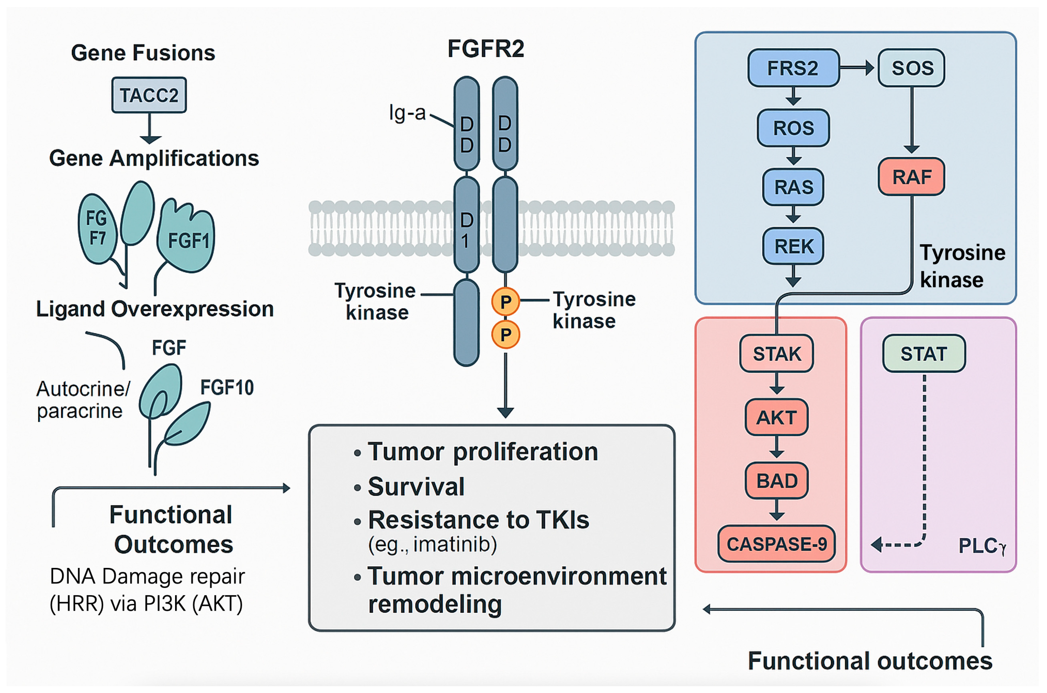 FGFR2 amplifications | 1–2% [2,35,36] | Increased gene copy number → receptor overexpression and enhanced downstream signaling | Associated with higher tumor grade, aggressive behavior, and TKI resistance; potential biomarker for FGFR inhibitor sensitivity |