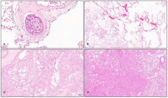 Representative pulmonary histopathology (hematoxylin–eosin stain). (A) Pulmonary infiltrates of metastatic prostatic adenocarcinoma with tumor emboli in vascular spaces. (B) Emphysematous changes with enlarged distal airspaces and alveolar septal destruction. (C) Acute organizing pneumonia with alveolar macrophage accumulation and fibrin deposition. (D) Bronchopneumonia with neutrophilic infiltration and proteinaceous exudates (original magnification: (A) ×200, (B–D) ×100). Scale bar (72 μm).
