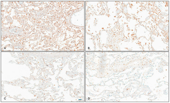 TMPRSS2 immunohistochemistry in lung tissue. (A,B), lung tissue from prostate cancer patients not treated with ADT showing strong TMPRSS2 expression (histoscores 221.1 and 277.5, respectively, Scale bar (72 μm)). (C,D), lung tissue from ADT-treated prostate cancer patients showing markedly reduced TMPRSS2 expression (histoscores 90.0 and 107.5, respectively) (original magnification ×200). Abbreviations: TMPRSS2, transmembrane protease serine 2.
