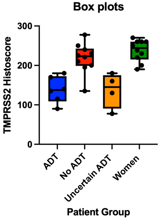 TMPRSS2 expression by patient group. Box plot showing distribution of TMPRSS2 histoscores across ADT-treated prostate cancer patients (n = 6), non-ADT prostate cancer patients (n = 10), patients with uncertain ADT status (n = 4), and women controls (n = 10). Boxes represent interquartile range, horizontal lines indicate median values, squares show means, and whiskers extend to minimum and maximum values within 1.5 × IQR. Individual data points are plotted as circles. TMPRSS2 expression was significantly reduced in ADT-treated patients compared to non-ADT patients (p = 0.037) and women (p = 0.024). Abbreviations: ADT, androgen deprivation therapy; AR, androgen receptor; and TMPRSS2, transmembrane protease serine 2.