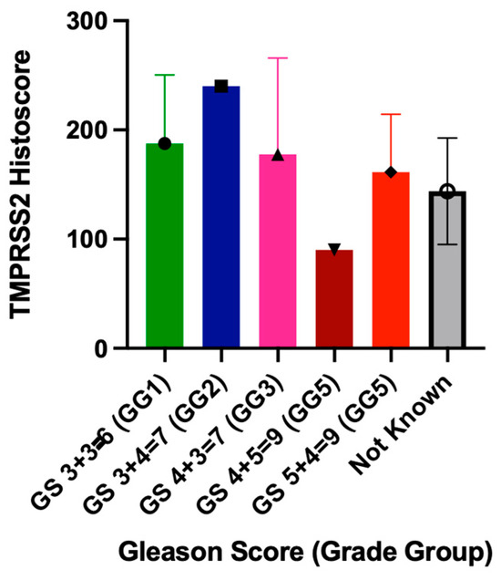 We observed no significant correlation between TMPRSS2 expression and prostate tumor Gleason scores (Figure 4). Gleason 6 cases (n = 8) showed a wide variation in TMPRSS2 histoscores (range: 107.5–277.5, mean: 187.5), while higher-grade tumors did not consistently exhibit higher TMPRSS2 expression. The absence of a linear relationship between the Gleason grade and TMPRSS2 histoscores suggests that tumor differentiation alone does not predict pulmonary TMPRSS2 expression.