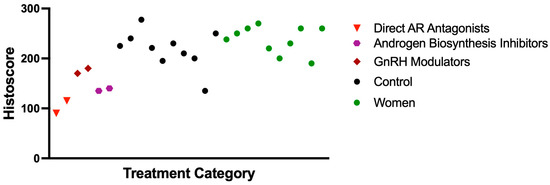 TMPRSS2 expression by specific ADT regimen. Individual patient histoscores grouped by ADT mechanism: Direct AR antagonists (bicalutamide + leuprolide, apalutamide + leuprolide), GnRH modulators (leuprolide monotherapy, degarelix), androgen biosynthesis inhibitors (abiraterone + leuprolide, orteronel + degarelix), and control groups (no ADT, women). Direct AR antagonists produced the most pronounced reduction in TMPRSS2 expression. Abbreviations: ADT, androgen deprivation therapy; AR, androgen receptor; TMPRSS2, transmembrane protease serine 2; and GnRH, gonadotropin-releasing hormone.