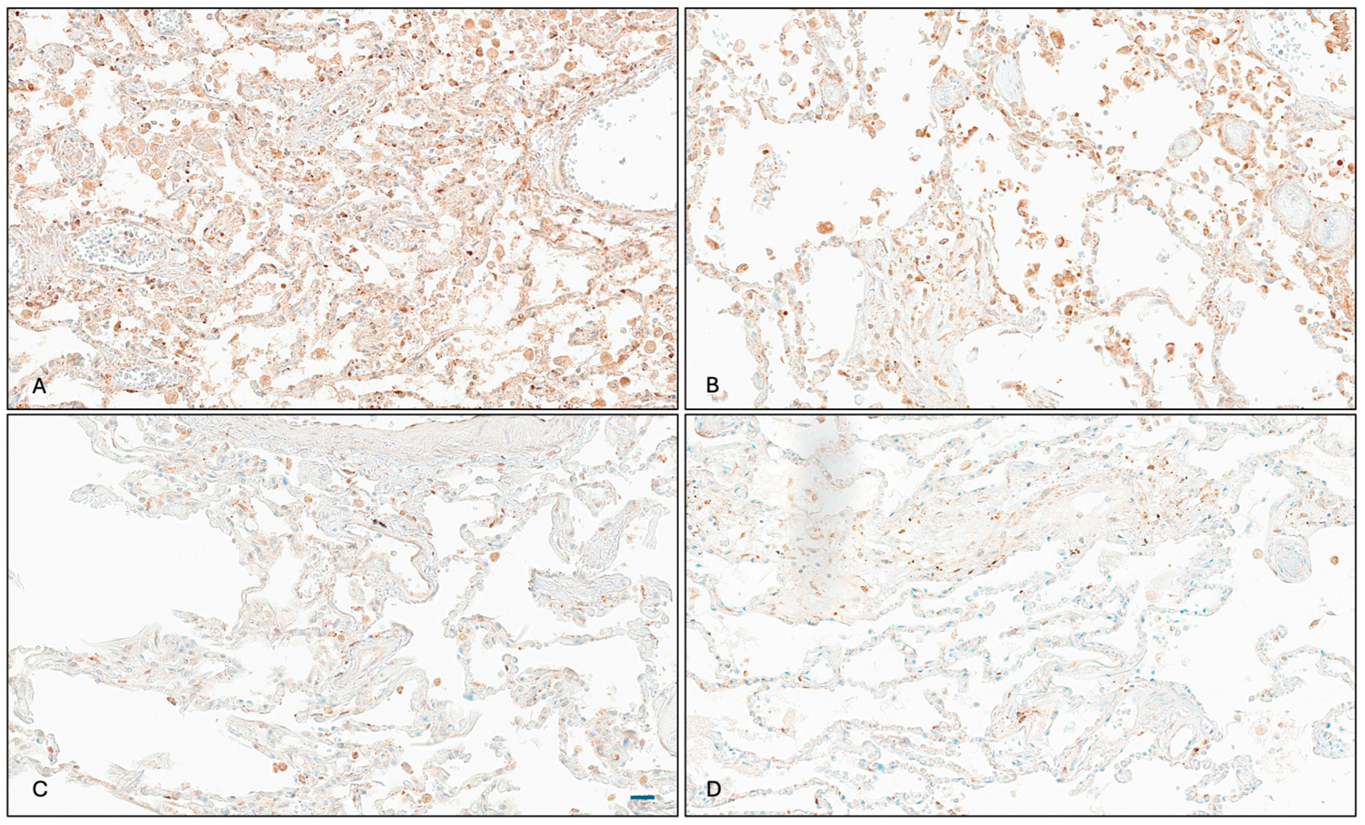 TMPRSS2-stained slides were digitally scanned at high resolution and independently analyzed by two pathologists blinded to clinical data. For each specimen, the percentage of pneumocyte staining was assessed, and nuclear staining intensity was categorized on a scale of 0 to 3 (0 = none, 1 = weak, 2 = moderate, 3 = strong). A histoscore was calculated for each sample using the formula (1 × [% cells with 1+ staining] + 2 × [% cells with 2+ staining] + 3 × [% cells with 3+ staining]), yielding scores ranging from 0 to 300, with higher values indicating greater TMPRSS2 expression.