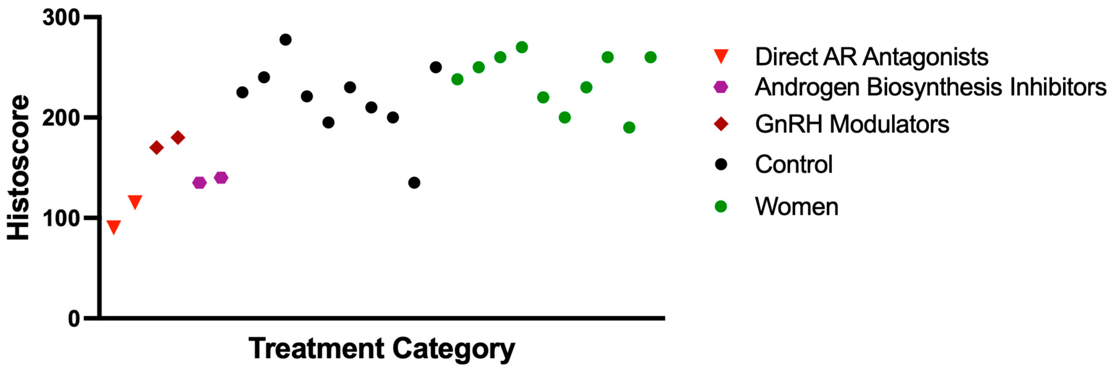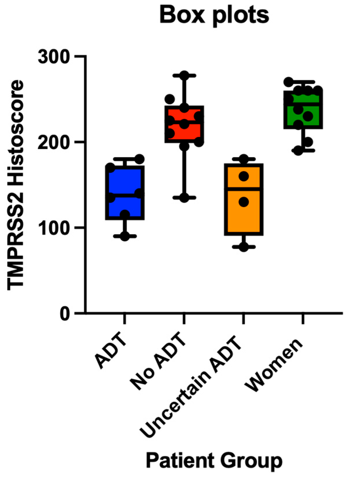 Notably, TMPRSS2 expression was also significantly lower in ADT-treated patients compared to women controls (mean histoscores: 152.7 vs. 238.0,