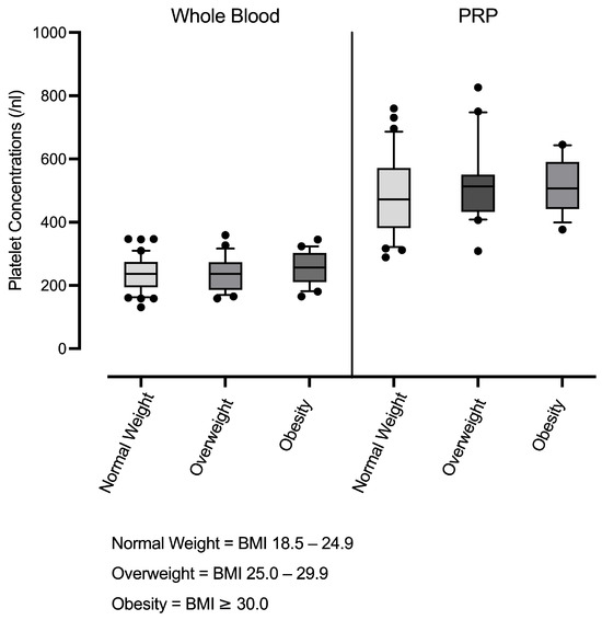 Platzer, H.; Bork, A.; Wellbrock, M.; Pourbozorg, G.; Gantz, S.; Sorbi, R.; Mayakrishnan, R.; Hagmann, S.; Bangert, Y.; Moradi, B. Association Between Body Mass Index and the Composition of Leucocyte-Poor Platelet-Rich Plasma: Implications for Personalized Approaches in Musculoskeletal Medicine. Curr. Issues Mol. Biol. 2025, 47, 824. https://doi.org/10.3390/cimb47100824