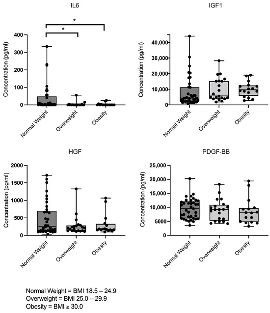 3.2. Growth Factor and Cytokine Levels in LP-PRP Stratified by BMI