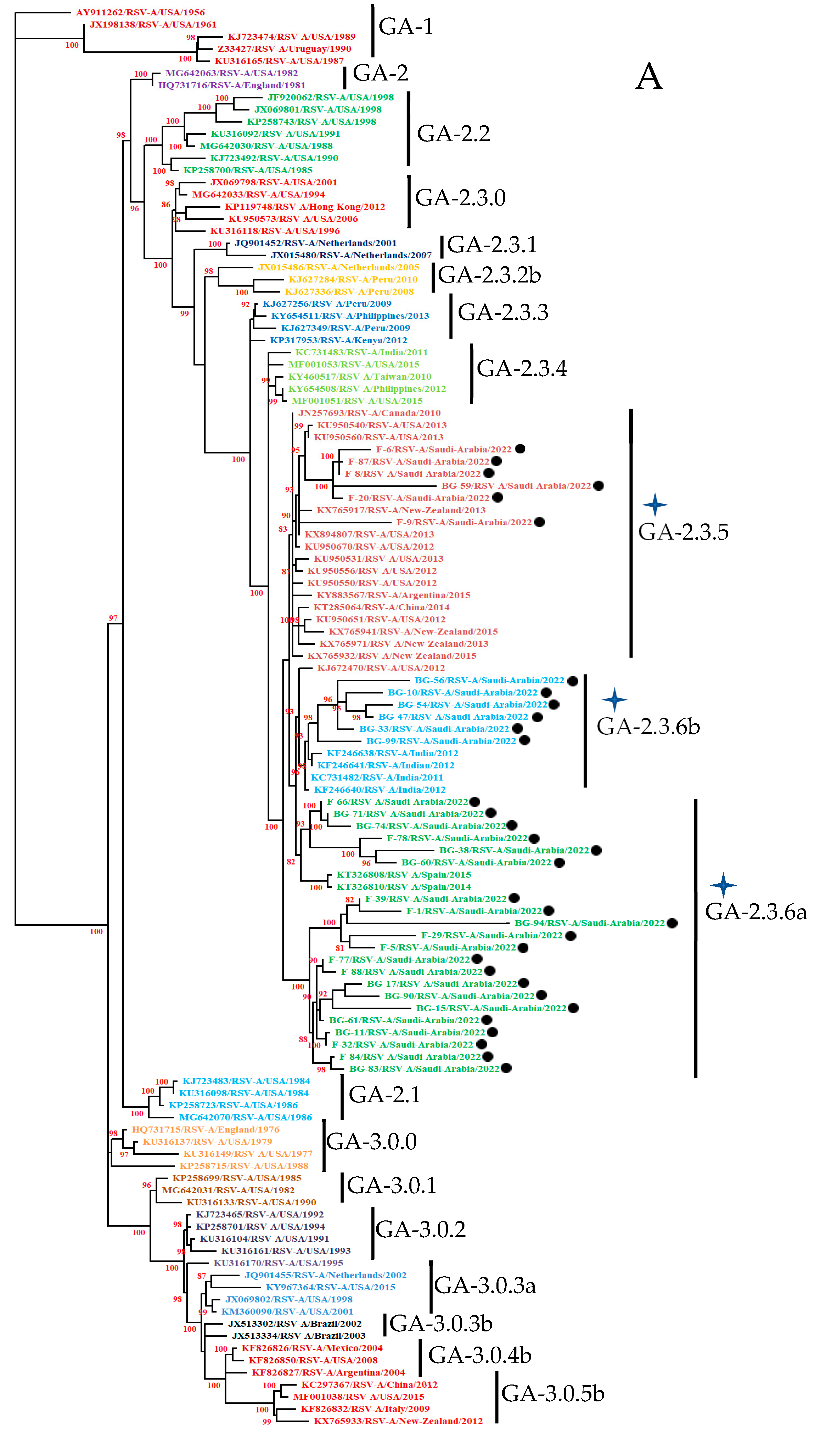 - Ahmed, A.; Alhetheel, A.; Parveen, S.; Almajhdi, F.N.; Alkubaisi, N.A.; Al-Saadi, M.M. Human RSVA-ON1, The Only Genotype Present During 2019–2020 Winter Season in Riyadh, Saudi Arabia: A Retrospective Study. Future Virol. 2023, 18, 1043–1055. [Google Scholar] [CrossRef]