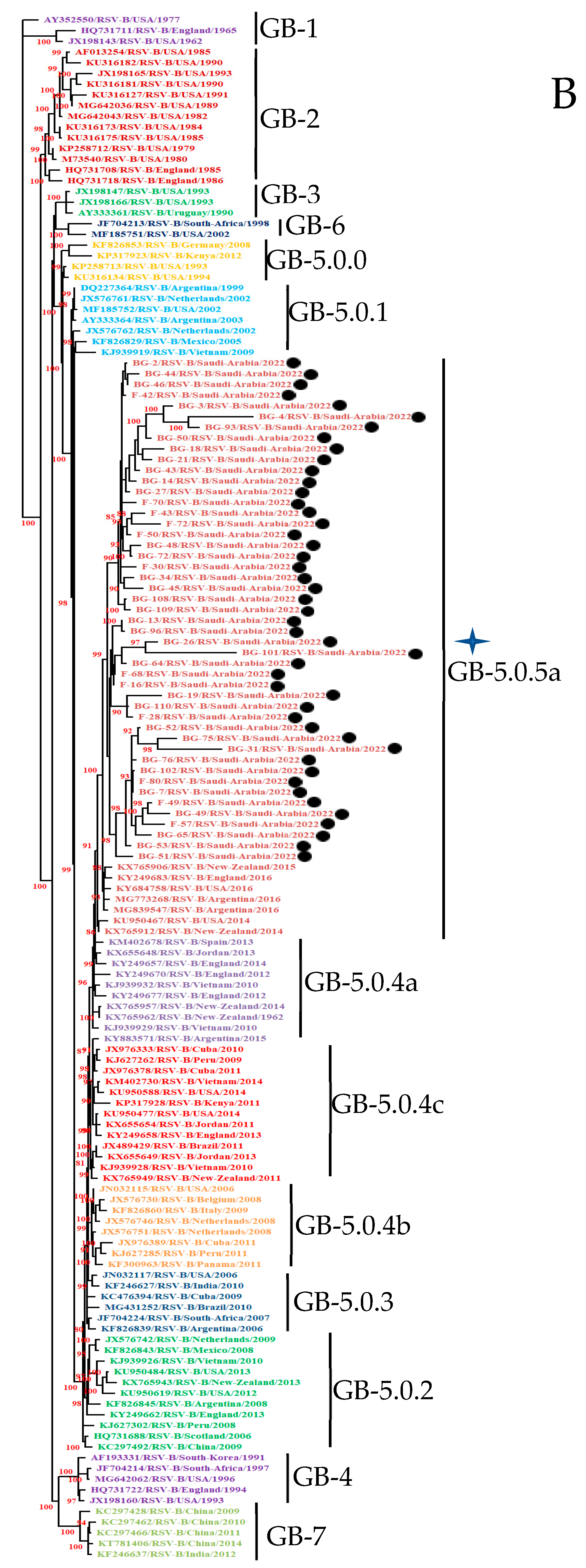 - Al-Sharif, H.A.; El-Kafrawy, S.A.; Yousef, J.M.; Kumosani, T.A.; Kamal, M.A.; Khathlan, N.A.; Kaki, R.M.; Alnajjar, A.A.; Azhar, E.I. Dominance of the ON1 Genotype of RSV-A and BA9 Genotype of RSV-B in Respiratory Cases from Jeddah, Saudi Arabia. Genes 2020, 11, 1323. [Google Scholar] [CrossRef]