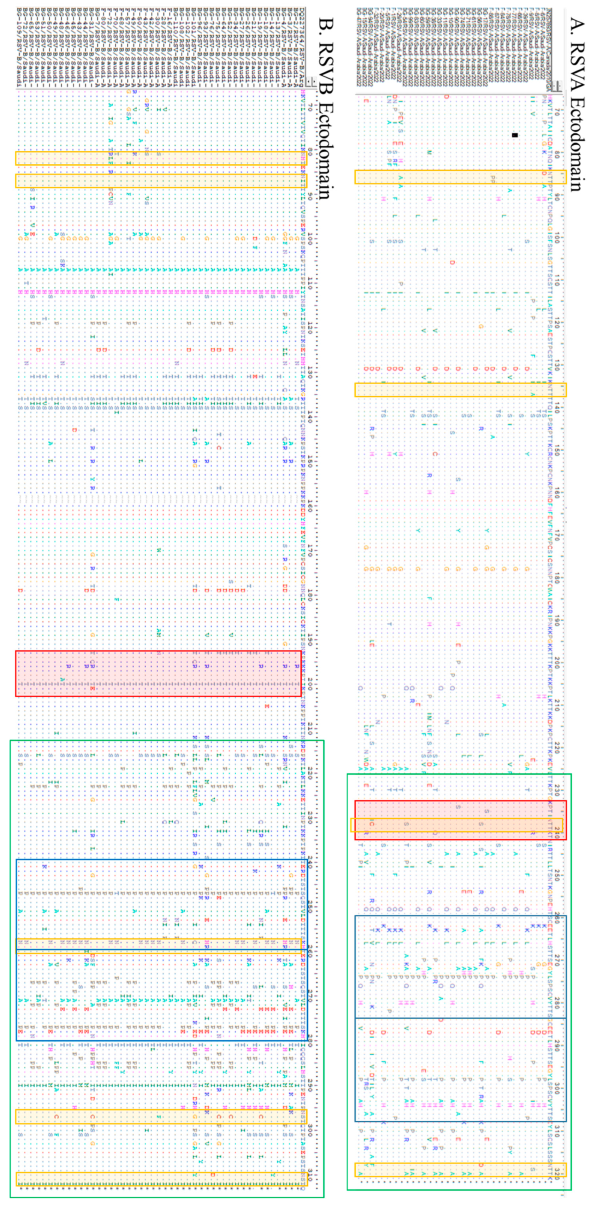 - Madi, N.; Sadeq, M.; Safar, H.A.; Al-Adwani, A.; Al-Turab, M. Circulation of new lineages of RSV-A and RSV-B in Kuwait shows high diversity in the N- and O-linked glycosylation sites in the G protein between 2020 and 2022. Front. Cell. Infect. Microbiol. 2024, 16, 1445115. [Google Scholar] [CrossRef]