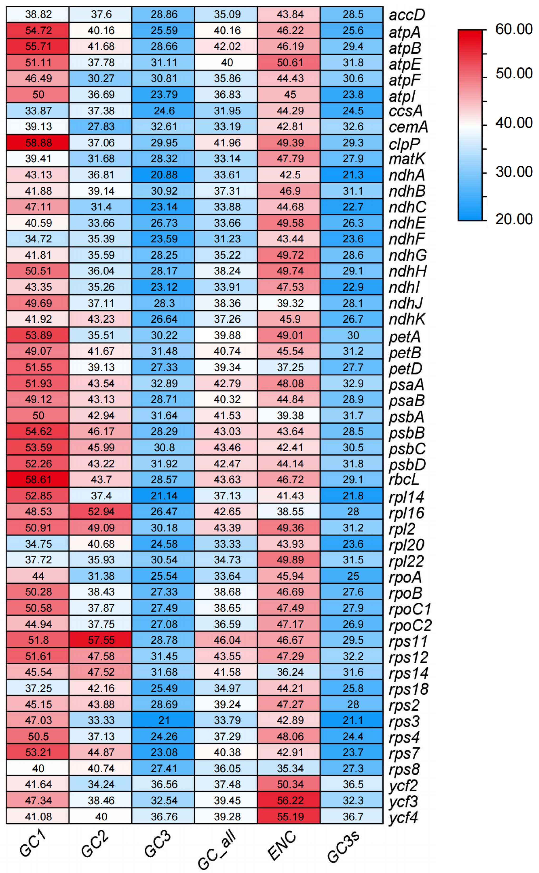 - Zhang, P.-P.; Xu, W.-B.; Lu, X.; Wang, L. Analysis of codon usage bias of chloroplast genomes in Gynostemma species. Physiol. Mol. Biol. Plants 2021, 27, 2727–2737. [Google Scholar] [CrossRef]