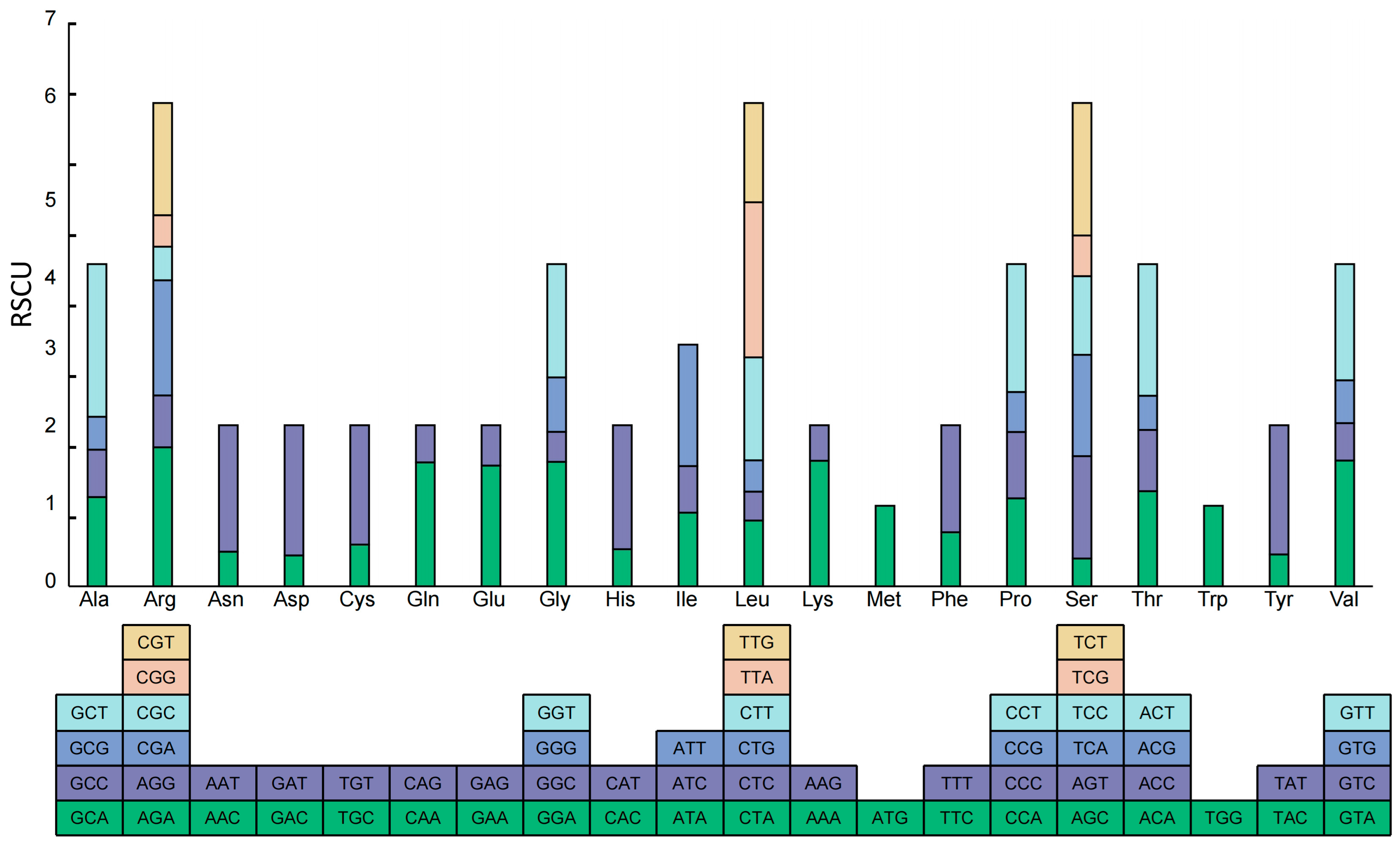 - Goetz, R.M.; Fuglsang, A. Correlation of codon bias measures with mRNA levels: Analysis of transcriptome data from Escherichia coli. Biochem. Biophys. Res. Commun. 2005, 327, 4–7. [Google Scholar] [CrossRef]