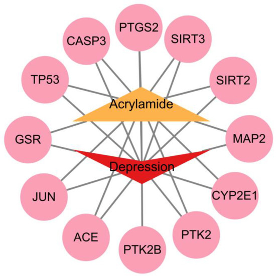 ACR-associated target genes were systematically identified by mining multiple bioinformatic databases (ChEMBL, STITCH, SwissTargetPrediction), yielding 34 unique molecular targets. Concurrently, disease-related targets for depression were extracted from GeneCards, OMIM, and TTD databases, retaining 5496 non-redundant targets after deduplication. Venn analysis revealed 12 overlapping targets, which were subsequently prioritized as shared candidate mechanisms linking ACR exposure to depression pathogenesis (Figure 2). The 12 overlapping targets were: TP53, PTGS2, JUN, CASP3, ACE, GSR, SIRT3, SIRT2, CYP2E1, PTK2B, PTK2 and MAP2. Cytoscape 3.10.2 software was used to create an ACR-target-depression network diagram (Figure 3).