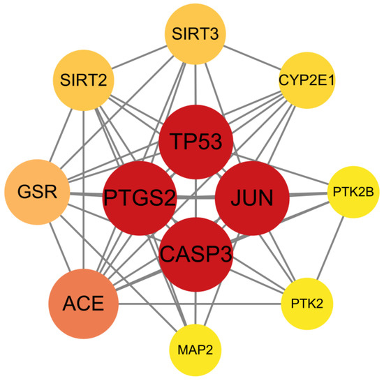 Protein–protein interaction (PPI) network of core targets. TP53, JUN, CASP3, and PTGS2 were identified as the most highly connected hub nodes, as indicated by their red-colored vertices in the network diagram.