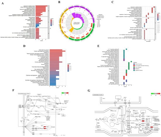 Functional enrichment analysis of GO and KEGG pathways. (A) GO histogram displaying the top 10 significantly enriched terms across BP, CC, and MF. Bar length corresponds to gene count; color intensity indicates statistical significance (red: Padjust < 0.01; blue: Padjust < 0.04). (B) Circular enrichment plot: outer ring labels enriched terms; inner ring quantifies gene numbers per term. (C) Bubble chart mapping pathway associations: bubble size represents gene quantity; color saturation denotes enrichment significance (red: Padjust < 0.01; blue: Padjust < 0.04). (D) KEGG enrichment histogram of the top 30 pathways. Bar length reflects gene enrichment frequency; color gradient encodes significance level (red: Padjust < 0.04; blue: Padjust < 0.012). (E) Lollipop plot visualizing pathway enrichment: vertical axis lists KEGG terms; horizontal position indicates enriched gene count. (F,G) Core target interactions within (F) neurotrophin and (G) serotonergic synapse signaling pathways. Red rectangles denote upregulated genes.