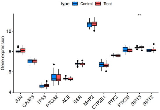 The GSE54567 and GSE54568 datasets were randomly selected to validate expression profiles of core genes. These datasets comprise human dorsolateral prefrontal cortex samples from 29 MDD patients and 29 controls. Among the 12 shared targets, TP53, JUN, CASP3, PTGS2 showed no significant expression changes (p > 0.05), whereas SIRT3 exhibited marked dysregulation (p < 0.01) and PTK2 demonstrated no significant difference (p > 0.05) in MDD cohorts (Figure 6).