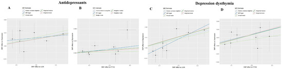 The scatter plots of MR analyses. (A) Analysis for “JUN” on “Antidepressant”. (B) Analysis for “PTGS2” on “Antidepressant”. (C) Analysis for “JUN” on “Depression–dysthymia”. (D) Analysis for “PTGS2” on “Depression–dysthymia”.