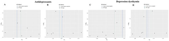 The funnel plots for assessing heterogeneity. (A) Analysis for “JUN” on “Antidepressant”. (B) Analysis for “PTGS2” on “Antidepressant”. (C) Analysis for “JUN” on “Depression–dysthymia”. (D) Analysis for “PTGS2” on “Depression–dysthymia”.
