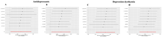 The leave-one-out plots for assessing the robustness. The horizontal red line represents the overall causal estimate using all instrumental variables (IVs). Each point depicts the causal estimate when the corresponding single nucleotide polymorphism (SNP) was omitted from the analysis. (A) Analysis for “JUN” on “Antidepressant”. (B) Analysis for “PTGS2” on “Antidepressant”. (C) Analysis for “JUN” on “Depression–dysthymia”. (D) Analysis for “PTGS2” on “Depression–dysthymia”.
