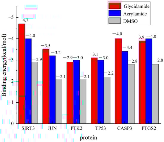 Comparative molecular docking binding affinities of ACR, GA, and DMSO with core target proteins. Binding energies (kcal/mol) for acrylamide (ACR, blue bars), its metabolite glycidamide (GA, red bars), and the negative control dimethyl sulfoxide (DMSO, gray bars) are shown.