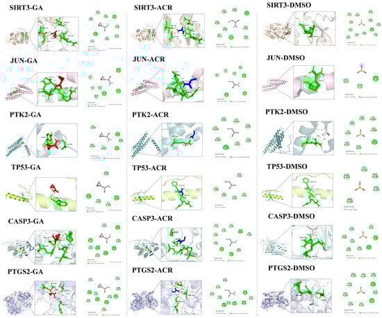 Molecular docking results of ACR, GA, and DMSO with SIRT3, JUN, PTK2, TP53, CASP3 and PTGS2 displaying the lowest binding energies in both 3D and 2D formats.