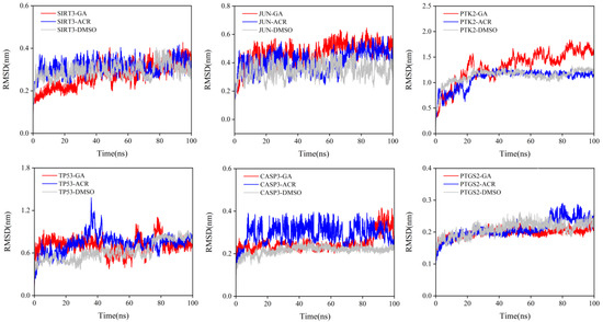 RMSD of the protein backbone during the 100 ns molecular dynamics simulations. The simulations were performed for the complexes of SIRT3, JUN, PTK2, TP53, CASP3, and PTGS2 with GA (red), ACR (blue), and DMSO (gray).