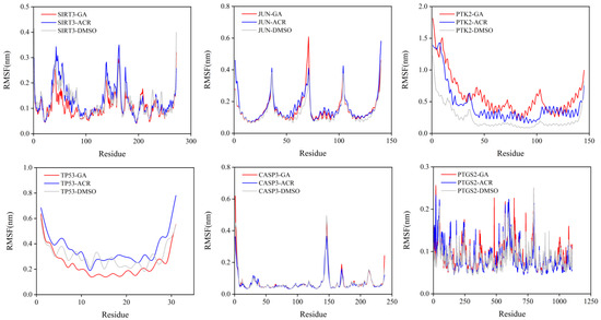 RMSF of the protein backbone during the 100 ns molecular dynamics simulations. The simulations were performed for the complexes of SIRT3, JUN, PTK2, TP53, CASP3, and PTGS2 with GA (red), ACR (blue), and DMSO (gray).