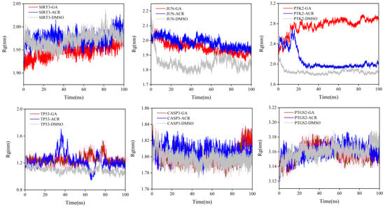 Rg trajectories for SIRT3, JUN, PTK2, TP53, CASP3 and PTGS2 complexed with GA (red), ACR (blue), and DMSO (gray) are shown.