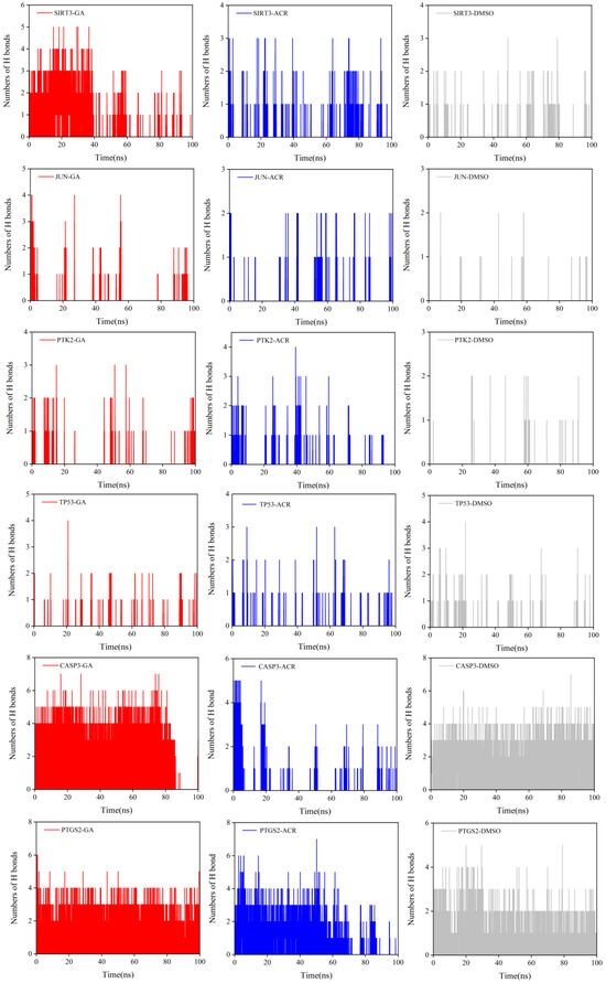 The number of hydrogen bonds for complexes of SIRT3, JUN, PTK2, TP53, CASP3, and PTGS2 with GA (red), ACR (blue), and DMSO (gray) are shown.