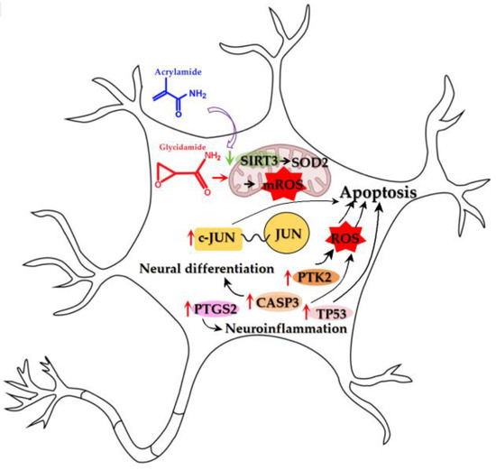 In addition to the SIRT3-JUN/PTK2 axis, our network toxicology approach identified TP53 and CASP3 as central nodes in ACR-induced neurotoxicity. It is important to emphasize that their predicted involvement is based on protein interaction networks, and their lack of transcriptional dysregulation in human depression datasets suggests a primary role at the post-translational level. This is consistent with their known mechanisms of action: TP53’s pro-apoptotic activity is often triggered by post-translational stabilization in response to DNA damage [38], while CASP3, the key executioner protease, is activated by proteolytic cleavage of its inactive zymogen [39]. Therefore, ACR-induced oxidative stress may lead to their functional activation without necessarily altering their mRNA abundance or attenuating oxidative neuronal death [40]. This notion is supported by evidence linking their activity to depression-related oxidative injury. For instance, dysregulation of the TP53 network may contribute to the pathogenesis of major depressive disorder [38]. Critically, oxidative stress severely affects the CNS due to high metabolic activity and limited regeneration. Elevated ROS levels induce oxidative macromolecular damage, which synergistically activates apoptosis and pro-inflammatory cascades [41]. Within this context, TP53 and CASP3 are hypothesized to act as critical downstream executors of apoptosis in our model, likely activated by the oxidative damage resulting from SIRT3 suppression.