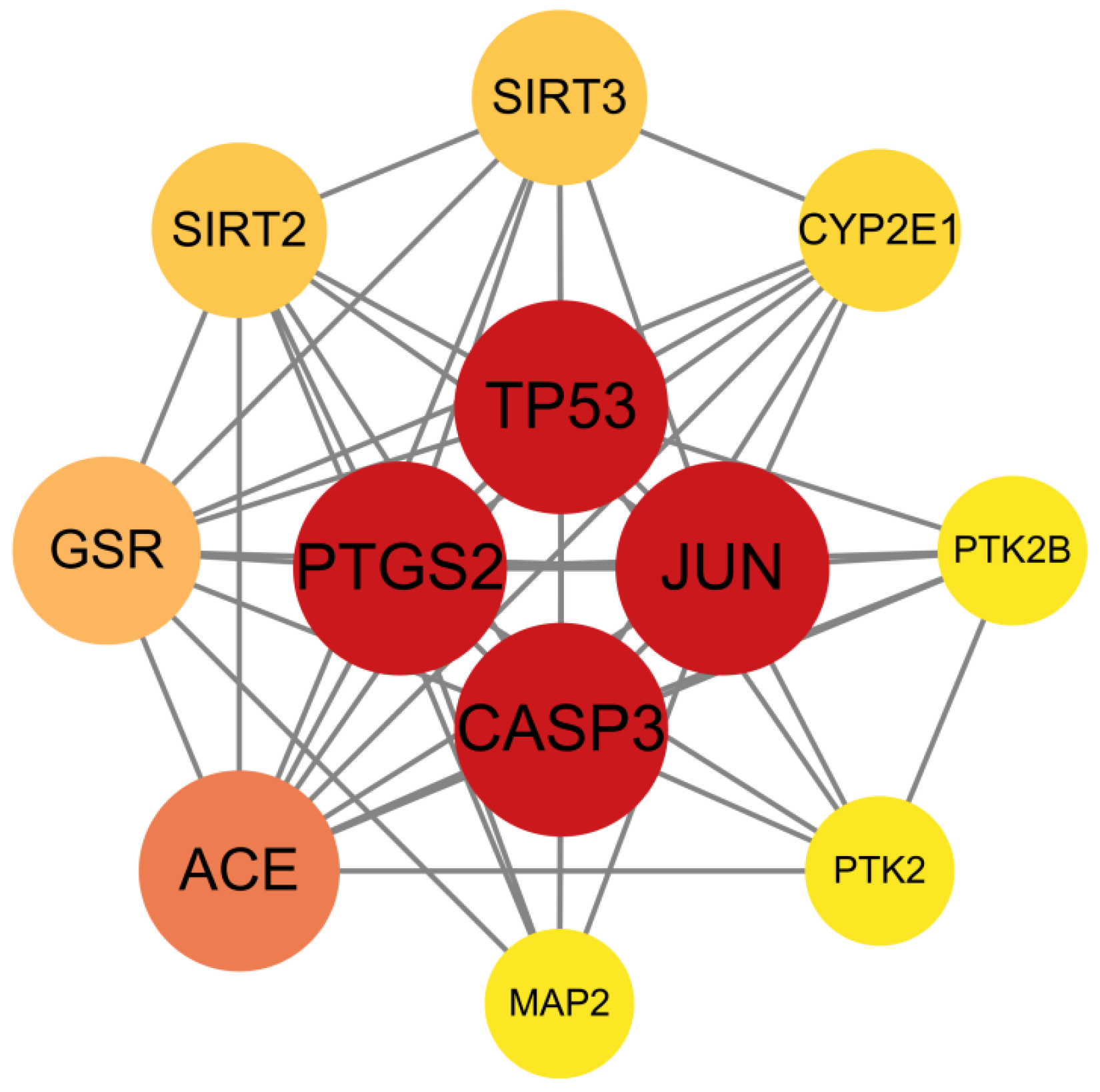 CASP3) were prioritized using degree thresholding (degree ≥ 11). Notably,
