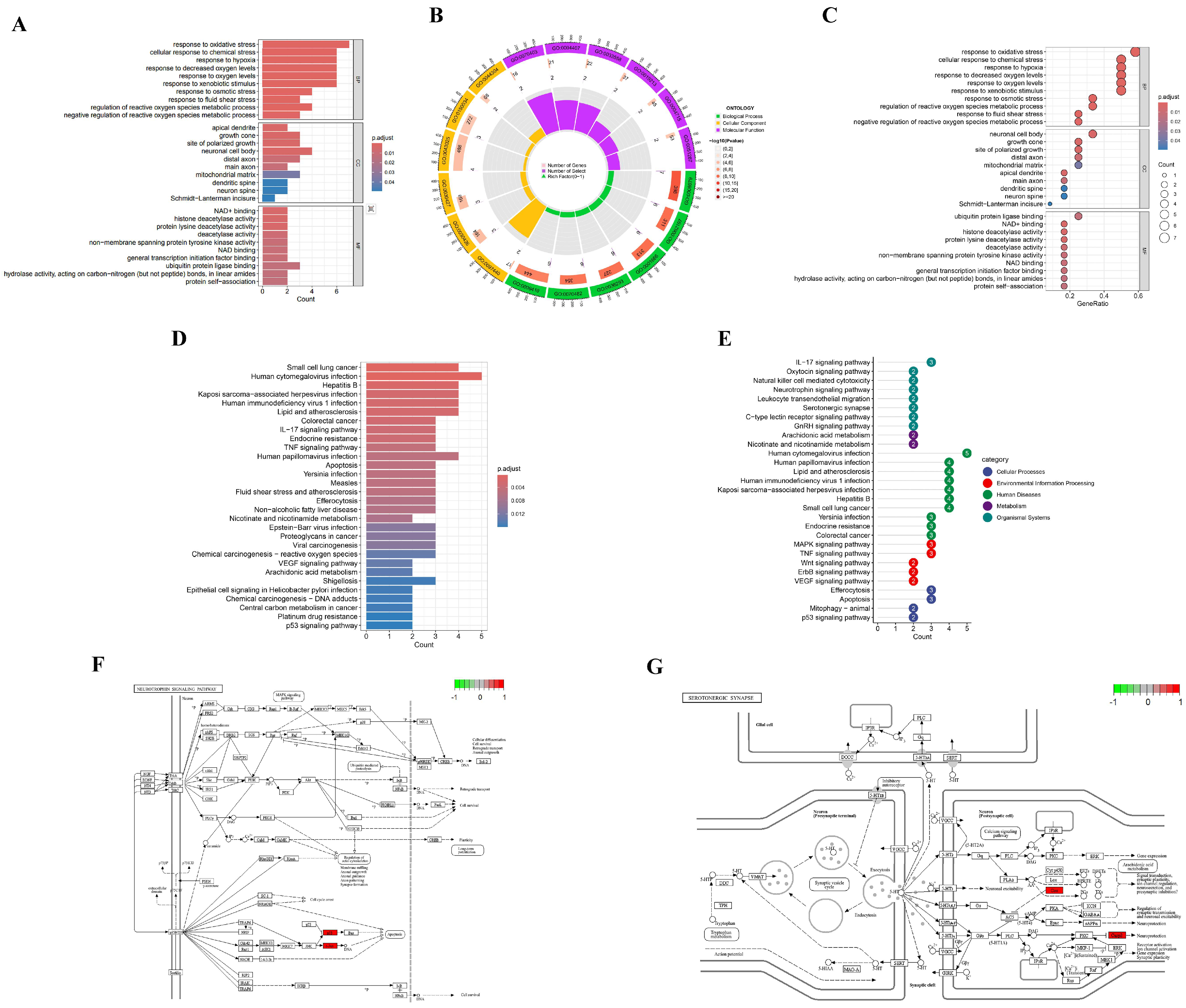 Figure 5C) demonstrated BP enrichment in oxidative stress regulation (Gene ratio = 0.58), CC clustering in neuronal cell bodies (Gene ratio = 0.33), and MF specialization in ubiquitin–protein ligase binding (Gene ratio = 0.25). Additionally, the top 30 signaling pathways were identified based on false discovery rate (FDR) and gene count, and visualized using histograms (