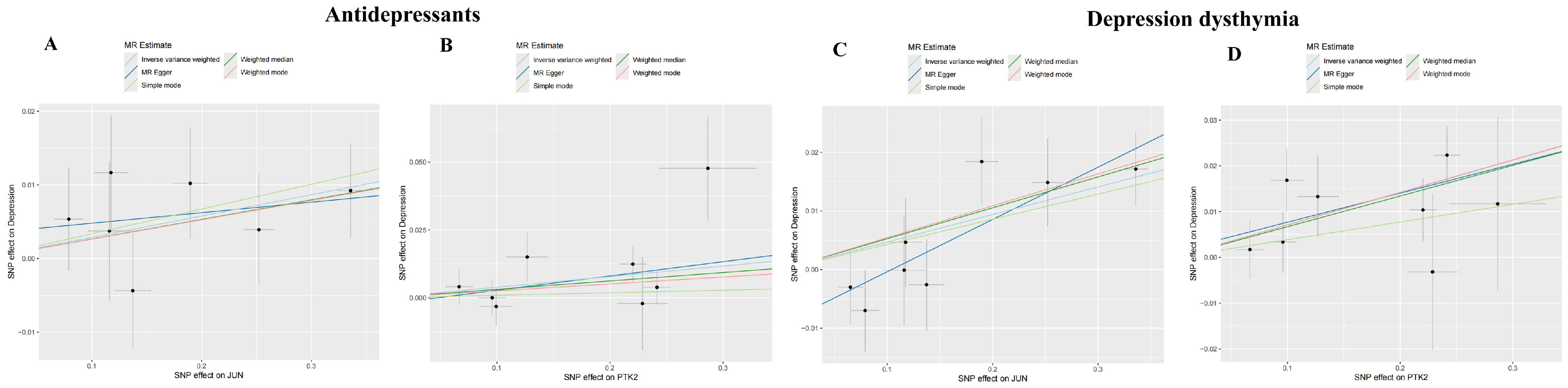 p = 0.736); “Depression–dysthymia”: JUN intercept = −0.009 (