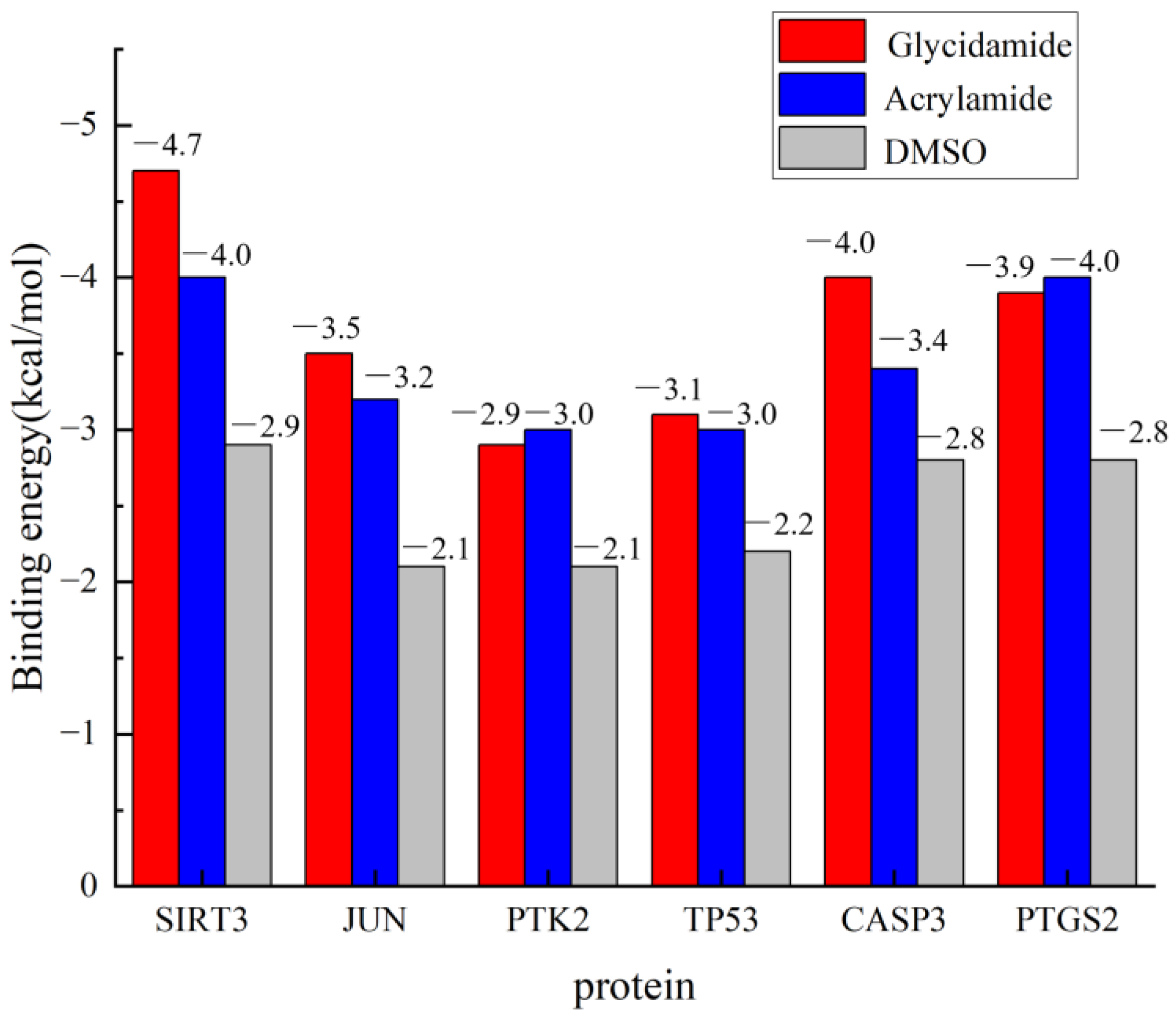 3.7. Molecular Docking of ACR, Its Metabolite GA, and Negative Control DMSO with Core Targets