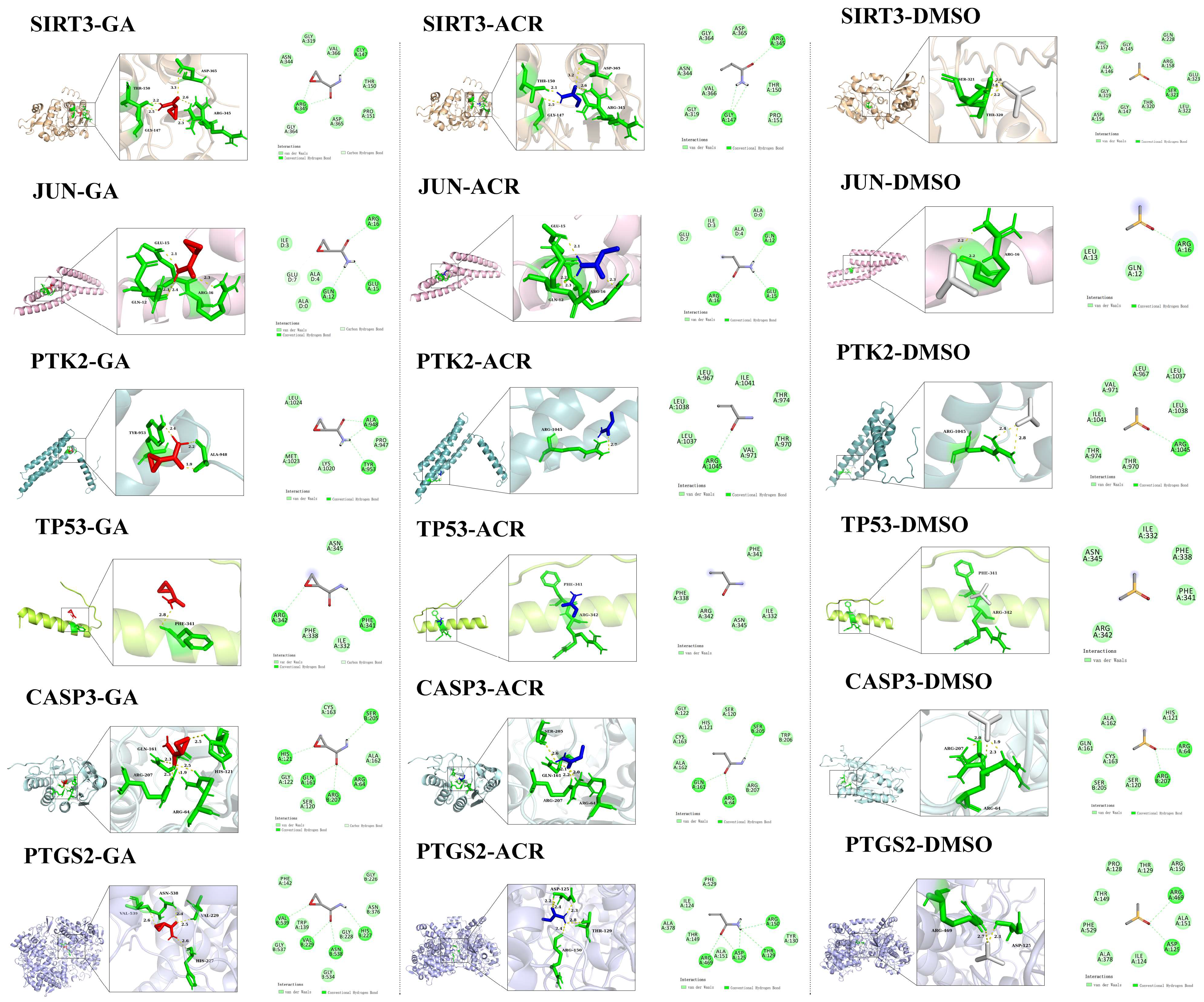 In response to reviewer comments, we expanded our molecular docking simulations to include GA, the primary physiologically relevant metabolite of ACR, and DMSO as a negative control for non-specific weak binding. Simulations were performed against the core targets identified through our multi-omics integrative approach: TP53, JUN, CASP3, and PTGS2 (from network toxicology); SIRT3 (the sole significant differentially expressed gene from transcriptomics); and PTK2 (a Mendelian randomization-validated causal gene for depression).