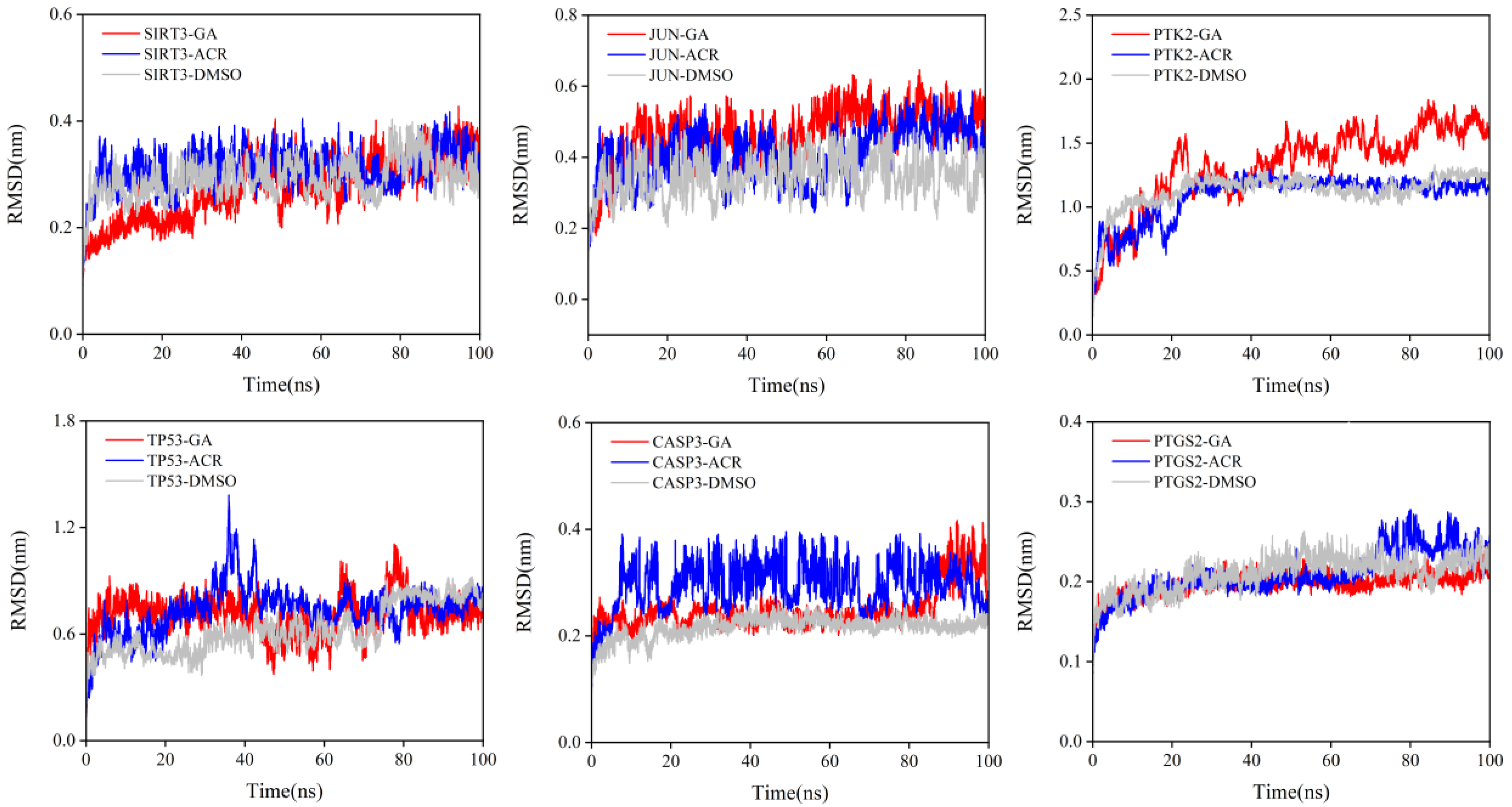 To mechanistically explain the superior binding affinity of glycidamide (GA) observed in molecular docking, we conducted 100 ns molecular dynamics (MD) simulations to evaluate the dynamic stability and binding modes of ACR, its metabolite GA, and the negative control DMSO across all six target proteins.