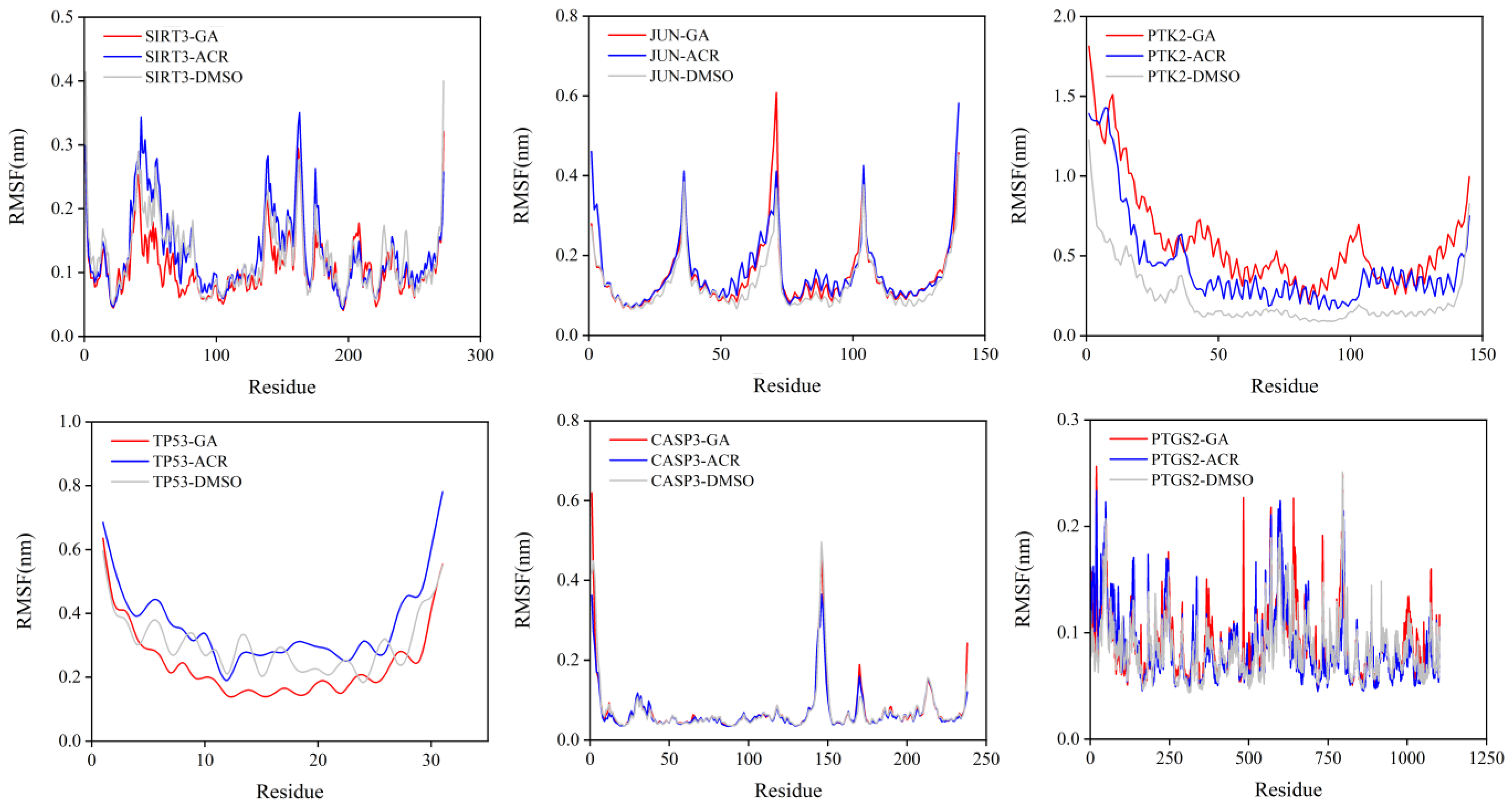 Figure 13). A consistent and notable trend was observed across all six target proteins. The complexes formed with GA exhibited significantly suppressed fluctuations, particularly in regions encompassing the binding sites and flexible loop domains. For example, in SIRT3 and TP53, key residues lining the active site showed a pronounced decrease in flexibility when bound to GA compared to both ACR and the control DMSO. This indicates that GA binding effectively “locks” these functionally important regions into a more rigid conformation. These RMSF results complement the global stability data from the RMSD analysis, demonstrating that the superior stability of GA complexes is achieved through specific interactions that significantly reduce local backbone flexibility, likely contributing to tighter binding and prolonged residence time.