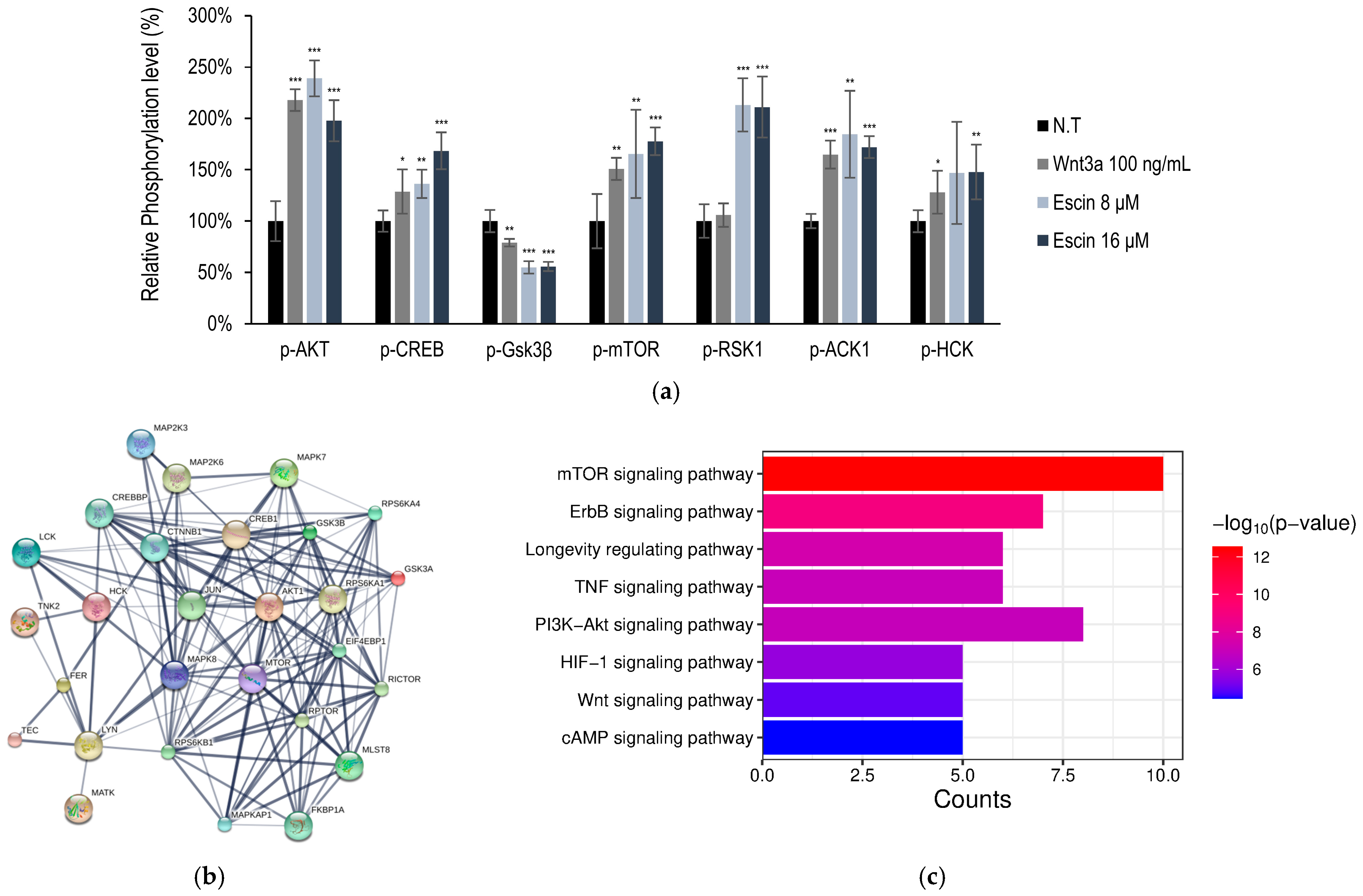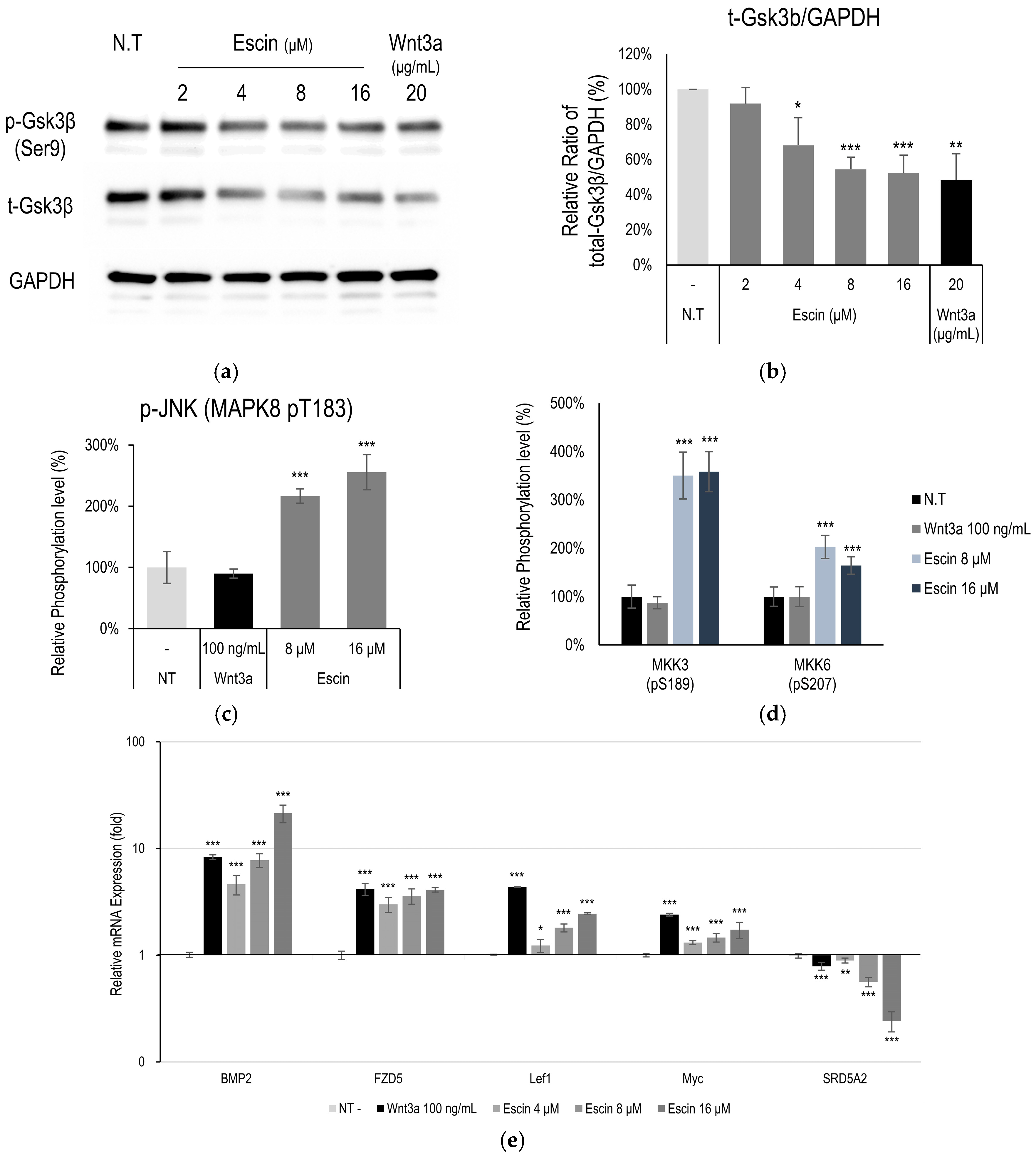 - Shin, J.Y.; Kim, J.; Choi, Y.-H.; Lee, S.; Kang, N.-G. Escin Activates Canonical Wnt/β-Catenin Signaling Pathway by Facilitating the Proteasomal Degradation of Glycogen Synthase Kinase-3β in Cultured Human Dermal Papilla Cells. Curr. Issues Mol. Biol. 2023, 45, 5902–5913. [Google Scholar] [CrossRef]