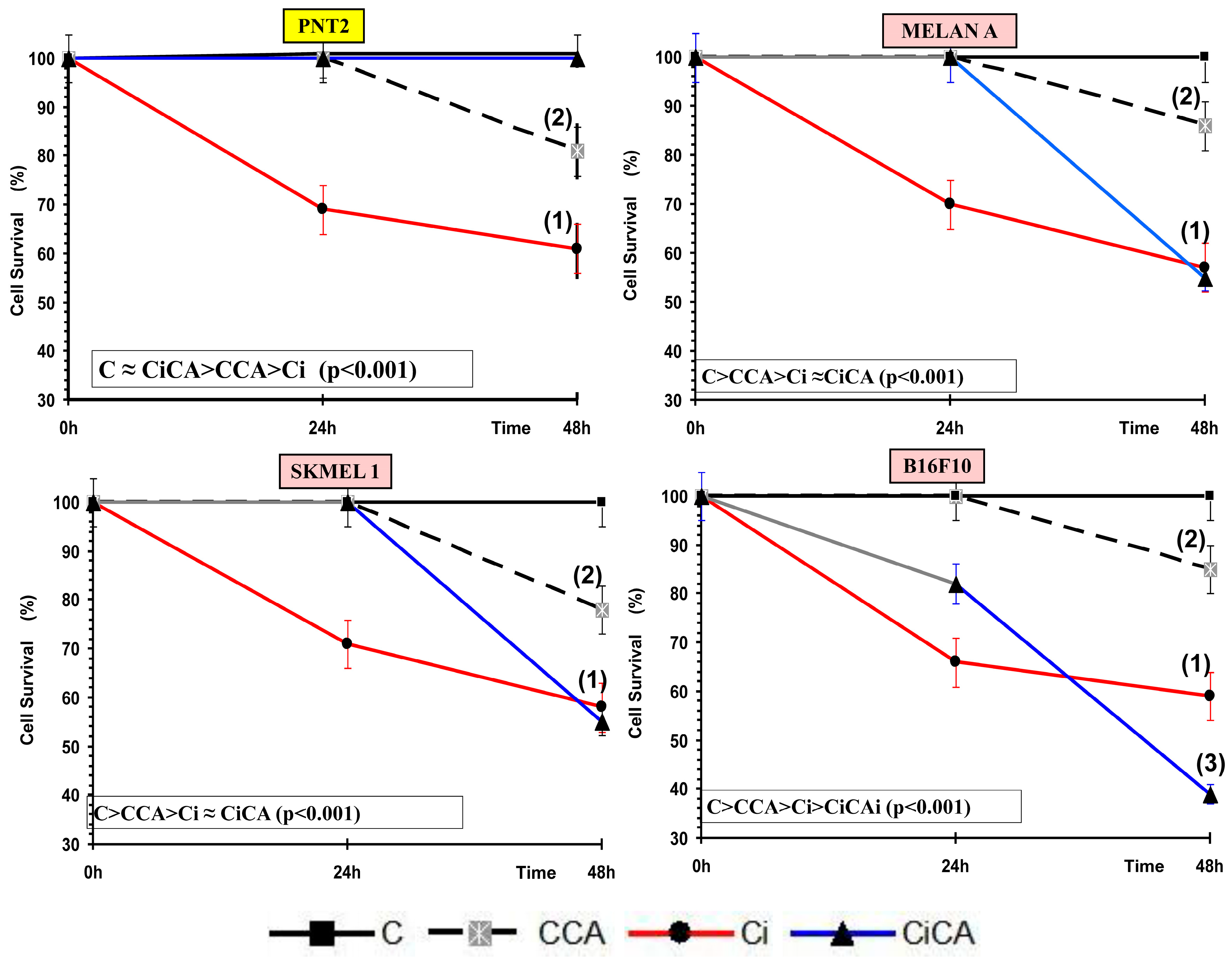 - Alcaraz, M.; Alcaraz-Saura, M.; Achel, D.G.; Olivares, A.; López-Morata, J.A.; Castillo, J. Radiosensitizing effect of rosmarinic acid in metastatic melanoma B16F10 cells. Anticancer Res. 2014, 34, 1913–1921. [Google Scholar]