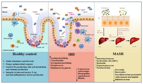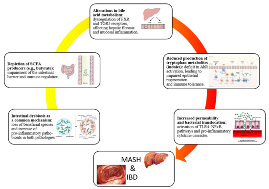 The human gut microbiota plays a critical role in maintaining intestinal homeostasis and regulating host metabolism and immune responses [1]. Disruptions in microbial composition and function, collectively referred to as gut dysbiosis, have been implicated in the development of various chronic inflammatory and metabolic disorders [2,3,4]. Among these, metabolic dysfunction-associated steatohepatitis (MASH) and inflammatory bowel disease (IBD) have gained increasing attention for their overlapping pathophysiological features linked to microbiota changes [5,6]. MASH, the progressive form of metabolic dysfunction-associated steatotic liver disease (MASLD), is characterized by hepatic steatosis, inflammation, and fibrosis, and is now one of the most common causes of chronic liver disease globally [7,8]. In this regard, MASLD is now recognized as the preferred term to describe hepatic steatosis linked to cardiometabolic abnormalities. It is diagnosed when evidence of liver fat accumulation, documented by imaging, histology, or validated biomarkers, coexists with at least one cardiometabolic risk factor such as overweight or obesity, type 2 diabetes mellitus (T2DM), hypertension, or dyslipidemia [9]. In contrast to the old non-alcoholic fatty liver disease definition, MASLD emphasizes the role of metabolic dysfunction rather than relying primarily on the exclusion of alcohol use [10]. Within the spectrum of fatty liver disease, MASH represents the progressive form, marked by steatosis along with hepatocyte ballooning and inflammation [11]. All individuals with MASH are included within the MASLD spectrum, yet only a subset of MASLD patients progress into MASH. The likelihood of progression is highest in those with cardiometabolic risk factors and genetic predispositions such as the Patatin-like phospholipase domain-containing protein 3 I148M variant [12]. Clinically, MASLD without inflammation is often stable, while MASH carries a much higher likelihood of advancing to fibrosis, cirrhosis, and hepatocellular carcinoma (HCC) [13]. IBD, which includes Crohn’s disease (CD) and ulcerative colitis (UC), is a group of chronic immune-mediated disorders affecting the gastrointestinal tract, driven by dysregulated immune responses to intestinal microbes in genetically susceptible individuals [14]. Despite differing in clinical manifestations, both MASH and IBD exhibit characteristic gut microbiota alterations. These include reduced microbial richness and alpha diversity, depletion of beneficial anti-inflammatory taxa such as Faecalibacterium prausnitzii and Akkermansia muciniphila, and an increased abundance of pro-inflammatory pathobionts such as Escherichia coli (E. coli) and members of the Enterobacteriaceae family [15,16,17]. Functional consequences of gut dysbiosis include impaired short-chain fatty acid (SCFA) production, disrupted bile acid metabolism, and increased intestinal permeability leading to bacterial translocation and systemic inflammation [18,19,20]. Crucially, these microbial shifts influence host physiology along the gut-liver axis, modulating hepatic inflammation and metabolic homeostasis, and along the gut-immune axis as well, promoting mucosal immune dysregulation [21,22]. Key mechanisms include toll-like receptor (TLR)-mediated signaling, compromised epithelial barrier integrity, and altered levels of microbial metabolites that impact immune tone and host metabolism [23,24]. A better understanding of these shared microbial and mechanistic pathways may shed light on how microbiota-driven inflammation and metabolic dysfunction interplay in MASH and IBD. As such, the present narrative review aims to synthesize current evidence on gut dysbiosis in both conditions, highlighting common pathogenic ways.