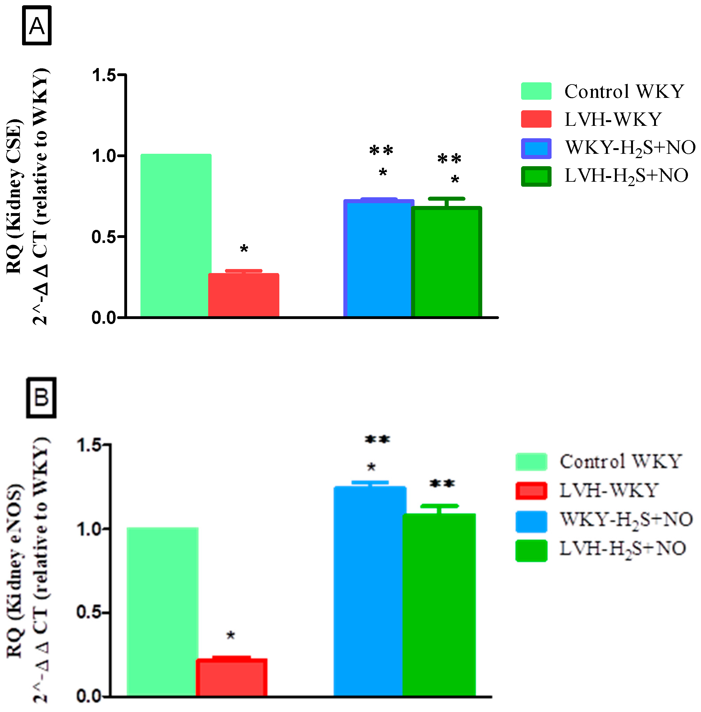 Figure 1. (A,B): Relative values of kidney (A) CSE mRNA and (B) eNOS mRNA between the WKY-H2S+NO, LVH-H2S+NO, Control WKY, and LVH-WKY groups. Relative to WKY, the 2-fold changes were calculated with the use of 2—normalized to 2. The findings are in mean plus SDM and statistical comparisons were performed with the help of one-way ANOVA and the Bonferroni post hoc test. A sample was analyzed twice on each of the three animals in each group (n = 9). * p < 0.05 vs. WKY and ** p < 0.05 vs. LVH-WKY.