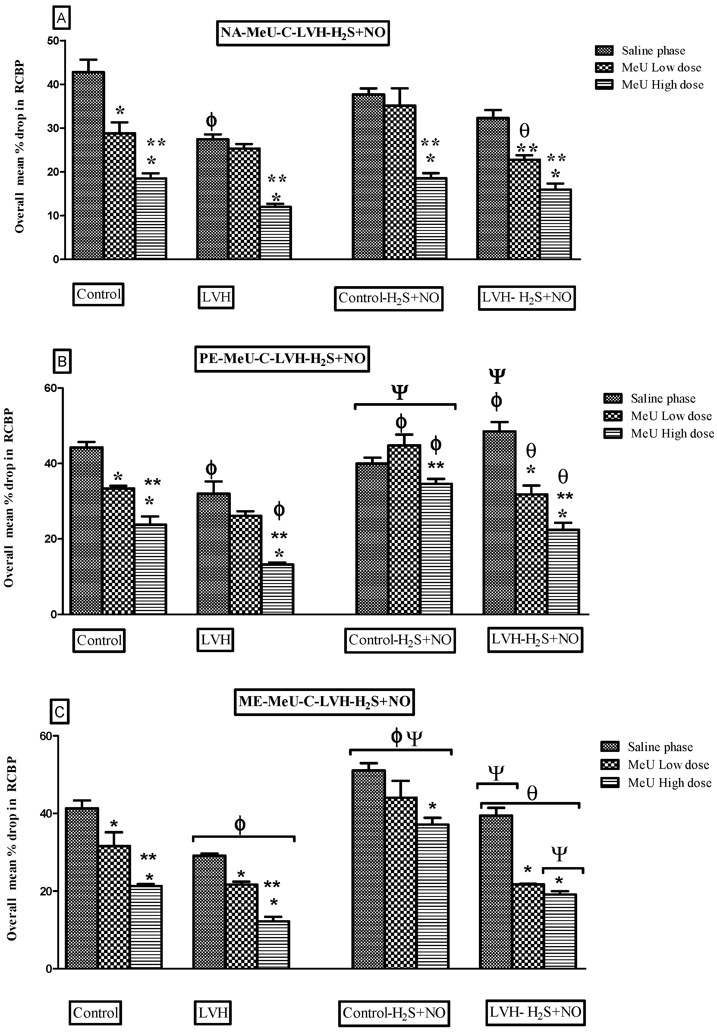 Figure 4. (AC): The bar graphs represent the mean percentage drop in RCBP to NA (A), PE (B), and ME (C) during saline, 5-MeU low-dose (LD), and high-dose (HD) administration in the Control WKY, LVH-WKY, Control-H2S+NO, and LVH-H2S+NO rat groups. Resulting data values are mean ± SDM (n = 7–5 rats per group), while statistical significance was considered at p < 0.05. * vs. saline phase of respective group; ** vs. low-dose phase of respective group; Φ vs. respective phase of Control group; Ψ vs. respective phase of LVH; θ vs. respective phase of Control-H2S+NO.