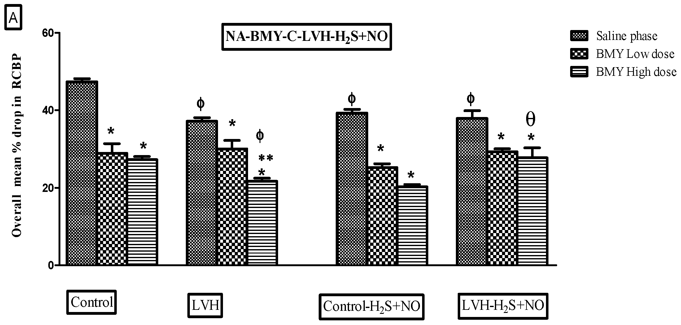 Figure 8. (AC): Bar graphs illustrating the mean percentage reduction in RCBP in response to NA (A), PE (B), and ME (C) in Control WKY, LVH-WKY, Control-H2S+NO, and LVH-H2S+NO rats during saline, low-dose (LD), and high-dose (HD) phases of BMY7378. Data are presented as mean ± SDM (n = 5–7 rats per group). p < 0.05 was considered statistically significant. * vs. saline phase of respective group; ** vs. low-dose phase of respective group; Φ vs. respective phase of control group; Ψ vs. respective phase of LVH; θ vs. respective phase of Control-H2S+NO.