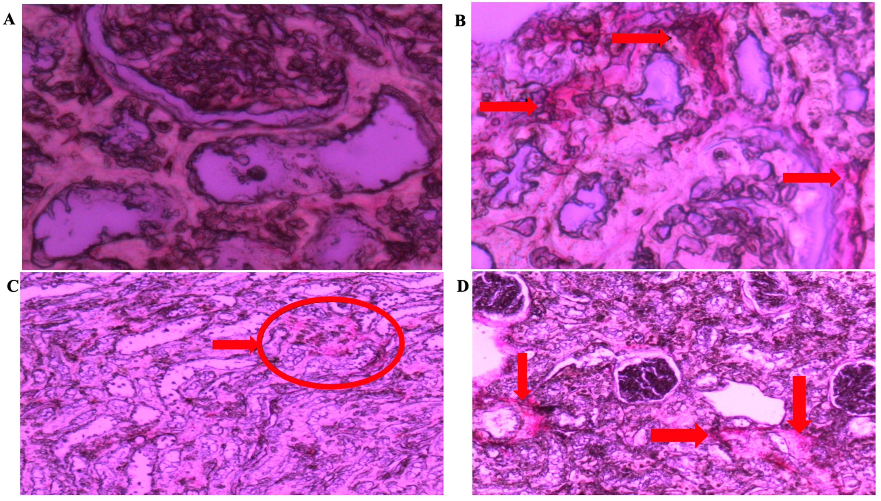 Figure 10. (AD): Light microscopy of kidney tissue sections (5 µm) stained with Picrosirius red at 400× magnification from (A) Control WKY, (B) LVH-WKY, (C) Control-H2S+NO, and (D) LVH-H2S+NO groups. Arrows and circles indicating the area of the collagen deposition.