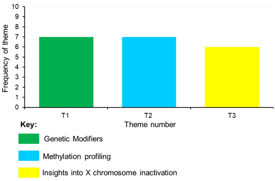 A thematic analysis was performed on the data from the 20 identified articles. This enabled the generation of meaningful themes from the extracted data. Selecting keywords derived from the data led to the identification of eightcodes and their interconnections: (1) disease expression and modifying factors, (2) molecular mediators, (3) methylation patterns, (4) genetic pathways for management, (5) biochemical pathology, (6) epigenetic regulation, (7) XCI patterns and mechanisms, and (8) clinical severity (Supplementary Table S2). These codes led to the emergence of three main themes: (I) ‘genetic modifiers’, (II) ‘methylation profiling’, and (III) ‘insights into X chromosome inactivation’. Themes 1 and 2 had the highest frequency, emerging from seven studies. Theme (III) had the lowest frequency, emerging from six studies (Figure 2). Each of the themes is described in the next section.