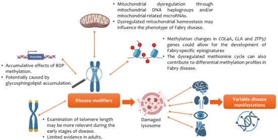 Examination of the mitochondrial genome (mtDNA) in 77 individuals with Fabry disease (35 male and 42 female) revealed that specific variants in mtDNA were more prevalent in individuals with Fabry disease when compared to neurotypical controls [60]. In particular, the study showed a disproportionate distribution of haplogroups H and I and cluster HV in individuals with Fabry disease. However, there was no association with gender, age of onset, or organ involvement. Nevertheless, the authors suggested that mtDNA haplogroups may have an important role in regulating oxidative stress in Fabry disease and warrant further investigation. Finally, a retrospective investigation of DNA methylation in the promoter region of the calcitonin receptor gene suggested that aberrant methylation of this gene could potentially serve as an epigenetic biomarker in individuals with Fabry disease on ERT [56].