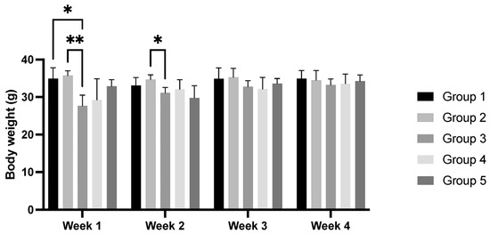 No statistically significant changes were observed in the food and water consumption of any of the groups over the four weeks of the experiment (p > 0.05). For all groups, the highest food and water consumption was observed at week 3 of the experiment, which decreased between the first and the last week of the experiment (p > 0.05) (Figure 1).