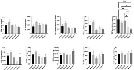 Oxidative stress parameters in the liver for each experimental group. Data are presented as mean ± standard error (S.E.). * p < 0.05; ** p < 0.01; *** p < 0.001. Groups: group 1—WT mice with standard diet; group 2—WT mice supplemented with 36% Pennisetum glaucum; group 3—HPV+ with standard diet; group 4—HPV+ mice supplemented with 29% Pennisetum glaucum; group 5—HPV+ mice supplemented with 36% Pennisetum glaucum.