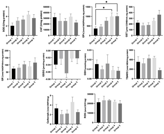 Regarding kidney oxidative stress, in a general way, the levels of stress markers were higher in the HPV+ groups (groups 3, 4 and 5) compared to the WT groups (groups 1 and 2). The levels of GPx were higher in groups 4 (HPV+, 29% Pennisetum glaucum) and 5 (HPV+, 36% Pennisetum glaucum), when compared with group 1 (WT, standard diet) (p < 0.05; Figure 4).