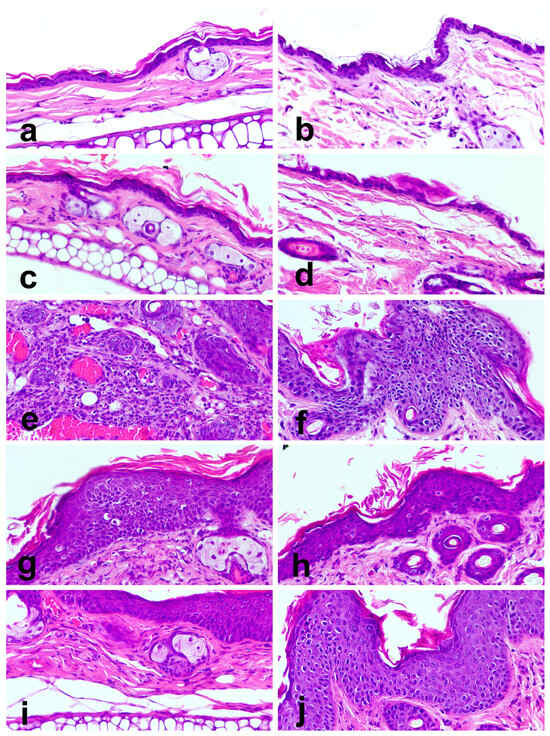 Epithelial carcinogenesis driven by HPV16 oncogenes in transgenic mouse skin, stained with hematoxylin and eosin, 400× magnification. Panels (a,b) show ear and chest skin, respectively, from wildtype (WT) mice receiving standard diet (group 1). Note normal skin histology. Panels (c,d) show ear and chest skin, respectively, from WT mice receiving 36% Pennisetum-supplemented diet (group 2). Note normal skin histology. Panels (e,f) show ear and chest skin, respectively, from HPV+ mice receiving standard diet (group 3). Note a squamous cell carcinoma (SCC) in panel (e) and epidermal dysplasia in panel (f). Panel (g,h) show ear and chest skin, respectively, from HPV+ mice receiving 29% Pennisetum-supplemented diet (group 4). Note epidermal dysplasia in both panels. Panels (i,j) show ear and chest skin, respectively, from HPV+ mice receiving 36% Pennisetum-supplemented diet (group 5). Note epidermal hyperplasia in both panels.