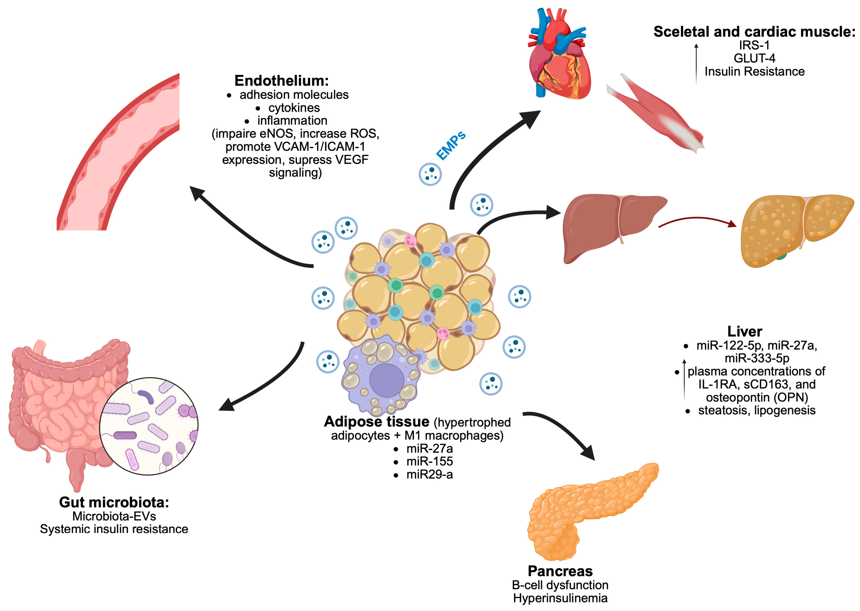 Cardiovascular complications | Endothelial-derived EVs, circulating endothelial cells (CECs), and microparticles (EMPs) reflect early vascular injury. Severe obesity is linked with greater CEC activation, while higher CEC number correlates with adiposity and blood pressure. EMPs and activated EMPs increase with adiposity and are associated with arterial stiffness and subclinical atherosclerosis. | Soltero et al.; 2021 [49]; Jang et al., 2022 [50] |